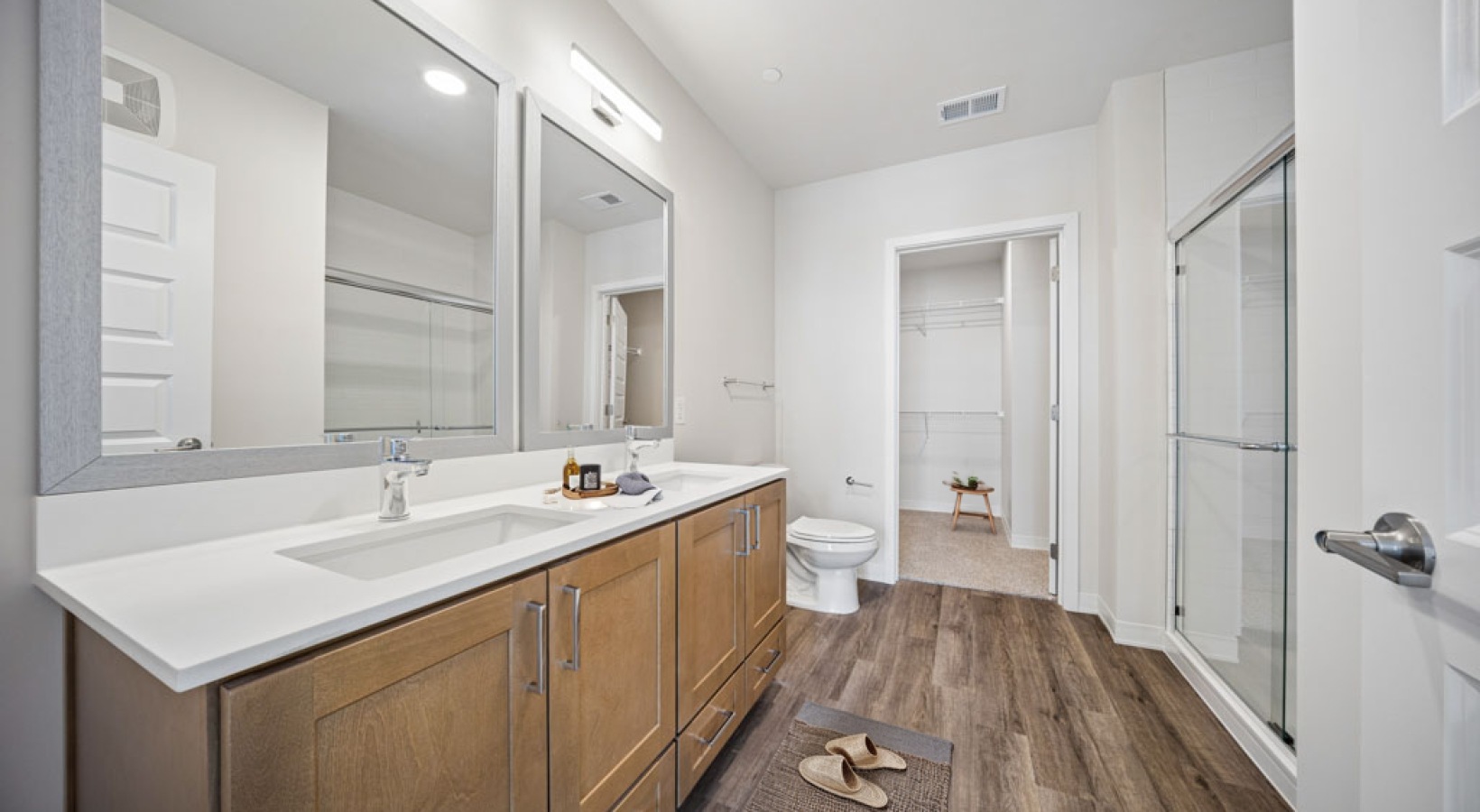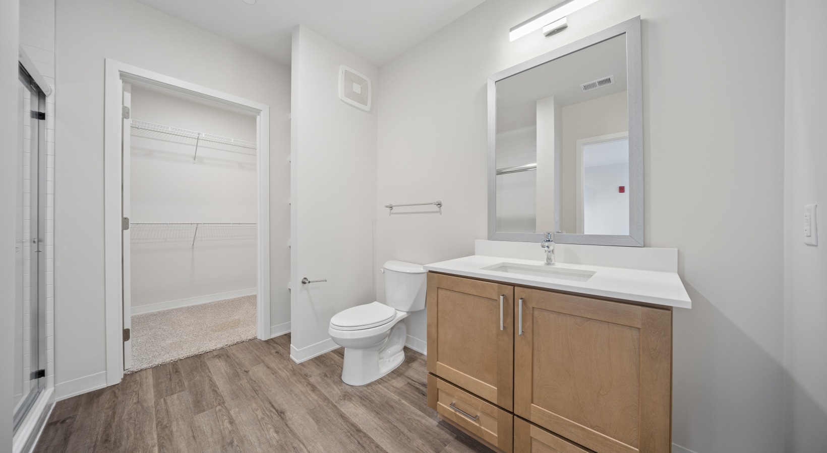 • brightly lit bathroom with white finishes and oak cabinets