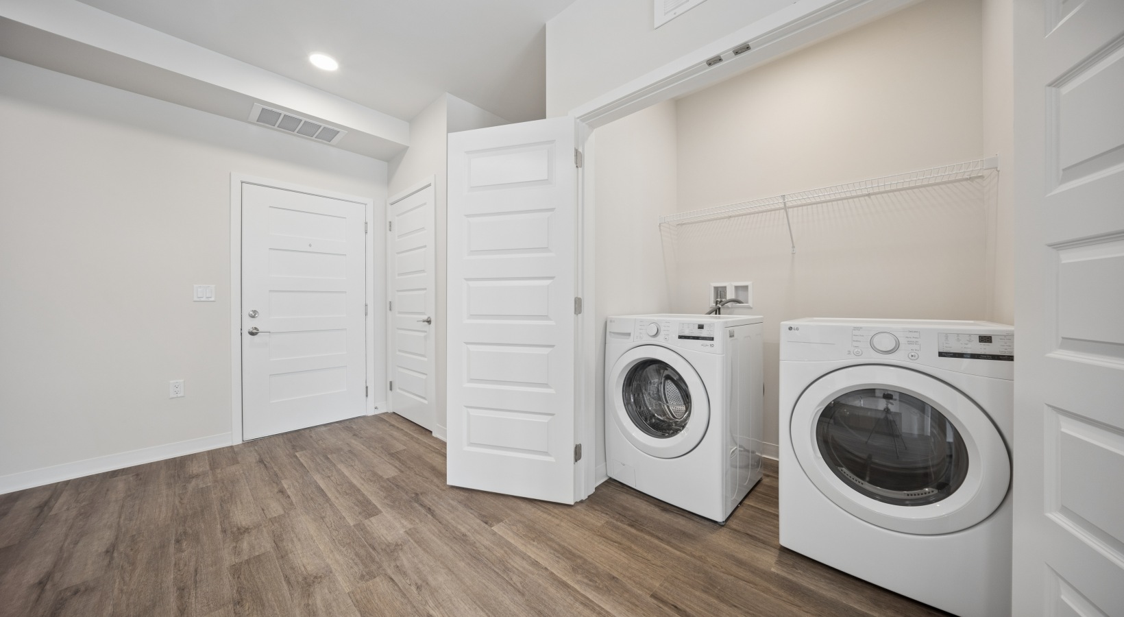 • matching set of white washer and dryer with open laundry closet doors