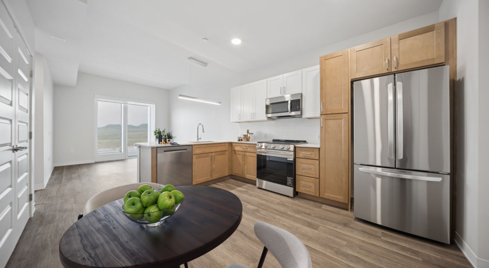 • modern kitchen with stainless steel appliances and a mix of wood colors
